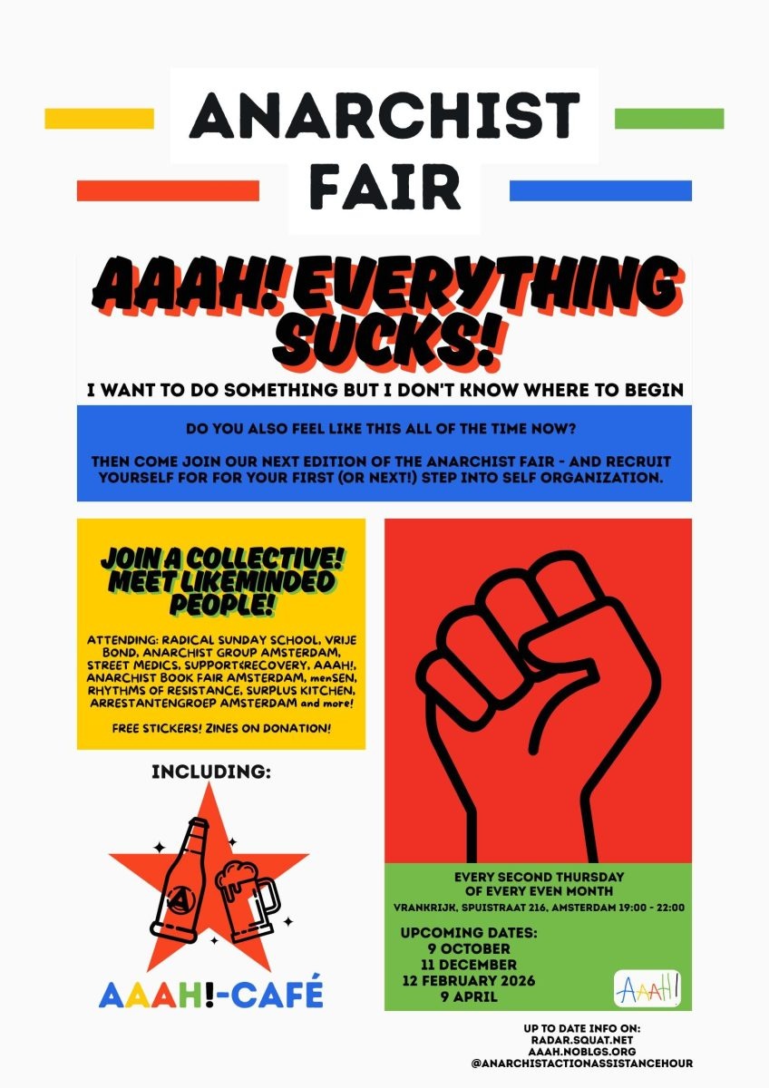9th of Oct, from 19:00 to 22:00. The anarchist fair is like a job fair, but you don’t get paid. It’s a place where people who want to do something but aren’t sure what can meet collectives and get to know them. We have many collectives that come by such as: Anarchist Book Fair, Paper Jam, Vrije Bond, menSEN, Rhythms of Resistance, Anarchist Bike Collective, and Amsterdam Street Medics.