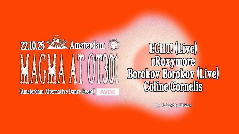 Brussels based Magma collective and EBB Music are teaming up for a special night filled with live shows and djs as part of Amsterdam Alternative Dance Event. At the core of the night: ECHT!, the Brussels-based quartet, returns to slap the dancefloor with their latest album Boilerism — a fierce blend of electro, trap and bass music, performed live with relentless precision and playful experimentation. They’ll be joined by the wildly unpredictable Borokov Borokov, blending angular synth-pop with hi-NRG, krautrock (with two t’s), supra-freudian elektrapunk, birthday-themed acid house, and multilingual lamentation. Also on the lineup: Coline Cornélis, resident of Magma since day one, who crafts deep, genre-blurring DJ sets where bass, emotion, and texture intertwine — sonic journeys for curious and open-minded dancefloors. And to close the night, rRoxymore will take us even deeper as the artist continues to be defined outside of common boundaries. Expect a night of raw, high-energy music in one of Amsterdam’s most iconic underground venues — the perfect way to kick off your AADE.