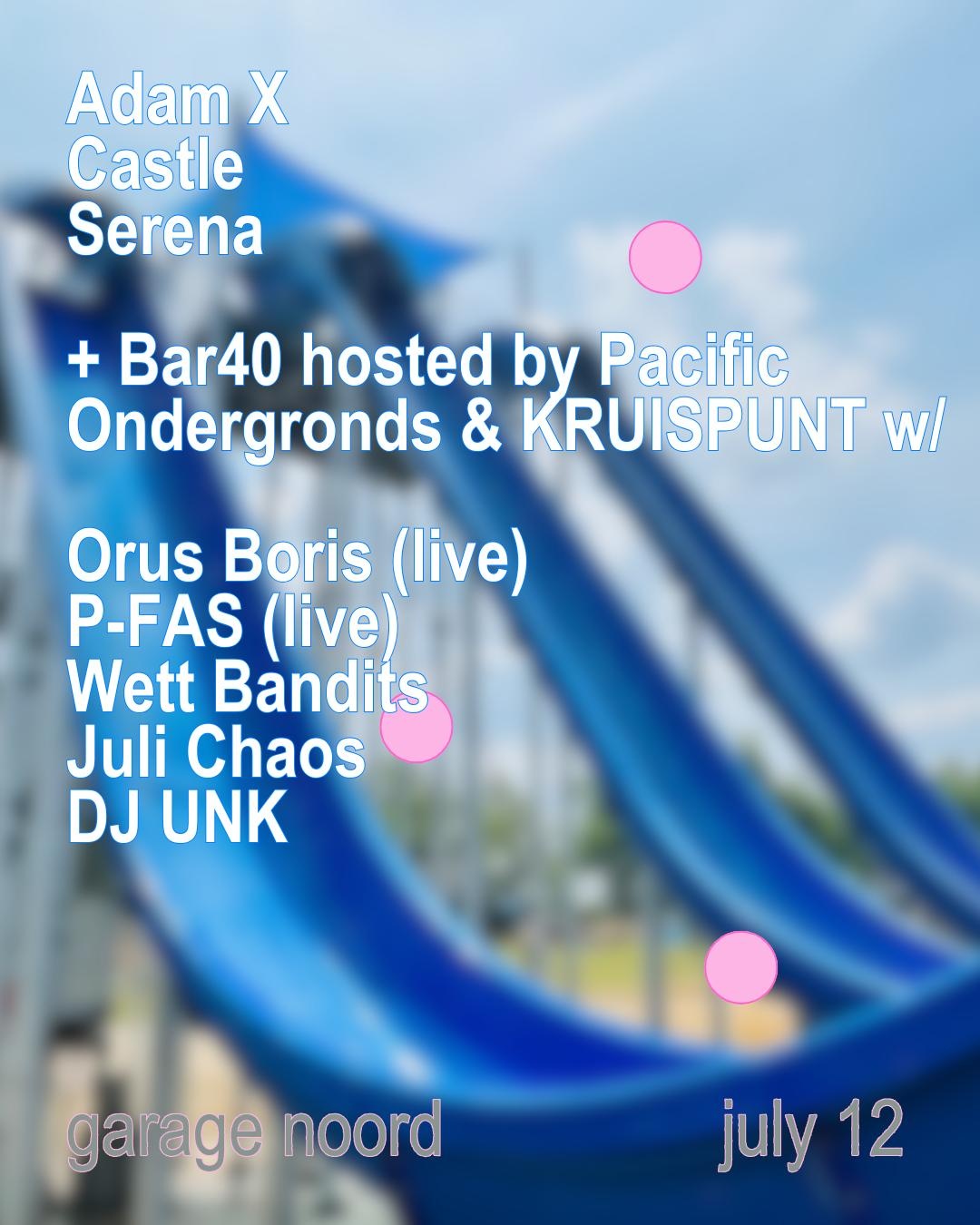 Adam X, Castle, Serena + Bar40 hosted by Pacific Ondergronds & KRUISPUNT w/ Orus Boris (live), P-FAS (live), Wett Bandits, Juli Chaos, DJ UNK