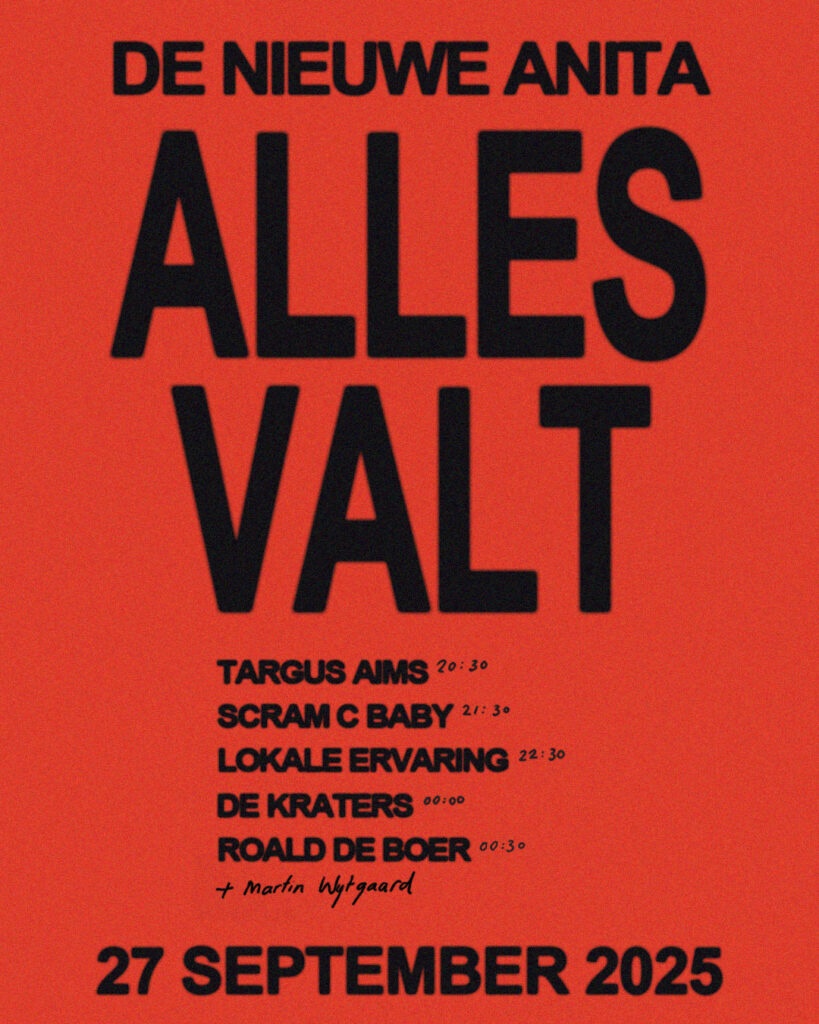 Live muziek van Targus Aims, Scram C Baby, Lokale Ervaring en de Kraters gevolgd door een DJ-set van Roald de Boer, met tussendoor poëzie van Martin Wijtgaard. Voor ieder wat wils: indierock, synthpunk, pianospel, tyfusherrie – gecureerd door Alle Valt.