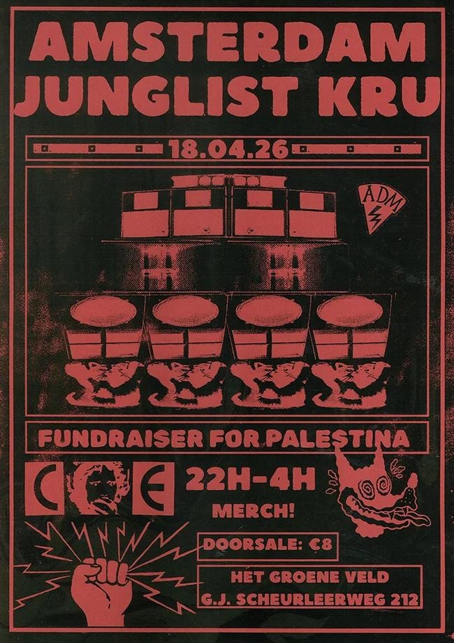 Amsterdam Junglist Kru meets ADM voor een spetterend benefiet voor Palestina met Jungle, Footwork, Bass & Breakbeats.