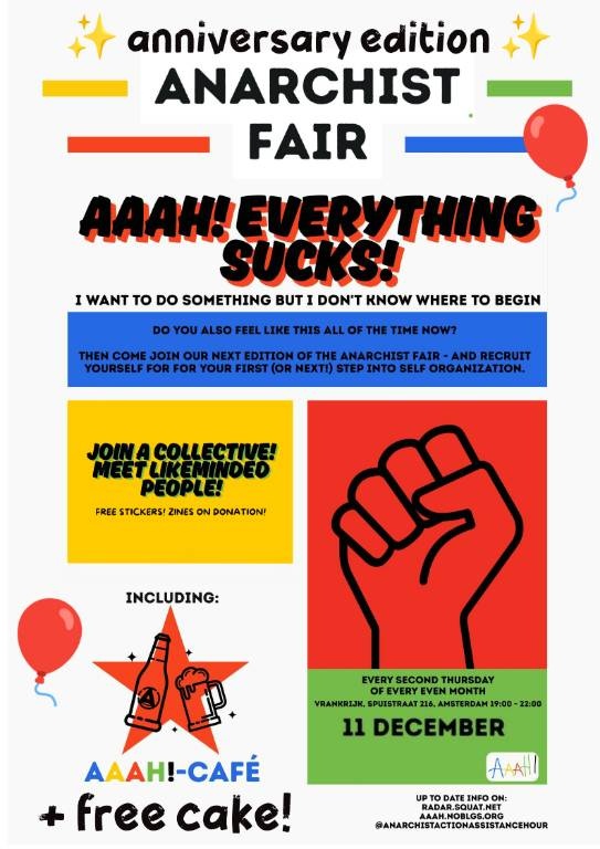 The anarchist fair is like a job fair, but you don’t get paid. It’s a place where people who want to do something but aren’t sure what can meet collectives and get to know them. We have many collectives that come by such as: Anarchist Book Fair, Paper Jam, Vrije Bond, menSEN, Rhythms of Resistance, Anarchist Bike Collective, and Amsterdam Street Medics. Come by, meet other anarchist folks, get new stickers and ‘zines! You only need to bring your self and some cash for drinks.