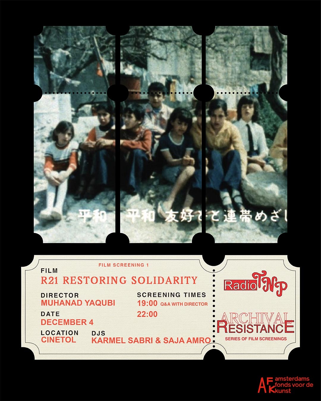 Tijdens de eerste Archival Resistance-vertoning zal Radio Tempo Nao Para de film R21 aka Restoring Solidarity laten zien, een documentaire van de Palestijnse filmmaker Mohanad Yaqubi. Deze 71-minuten durende film onthult een fascinerend archief: twintig 16mm-films, gemaakt tussen de jaren 1960 en 1980 door filmmakers die de Palestijnse bevrijdingsbeweging ondersteunden, en bewaard door een Japanse solidariteitsbeweging.
