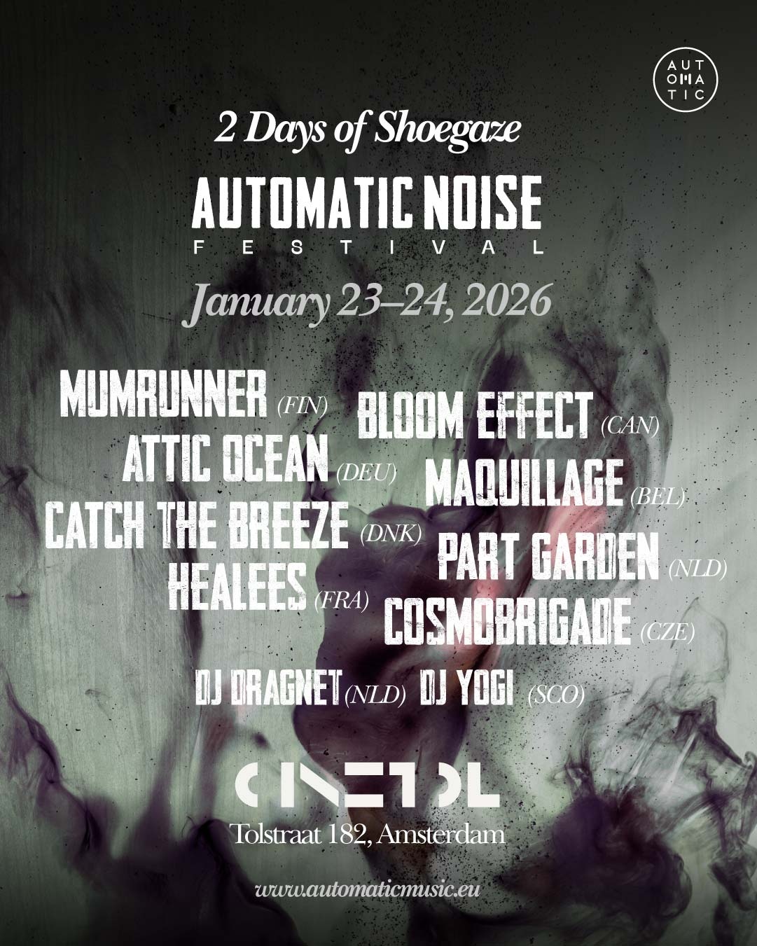 Het Automatic Noise Festival keert op 23 en 24 januari 2026 terug naar Amsterdam voor zijn zesde editie in Cinetol. Twee avonden lang viert het festival shoegaze en dreampop, en vormt het de afsluiting van de jaarlange viering van 20 jaar Automatic Music.