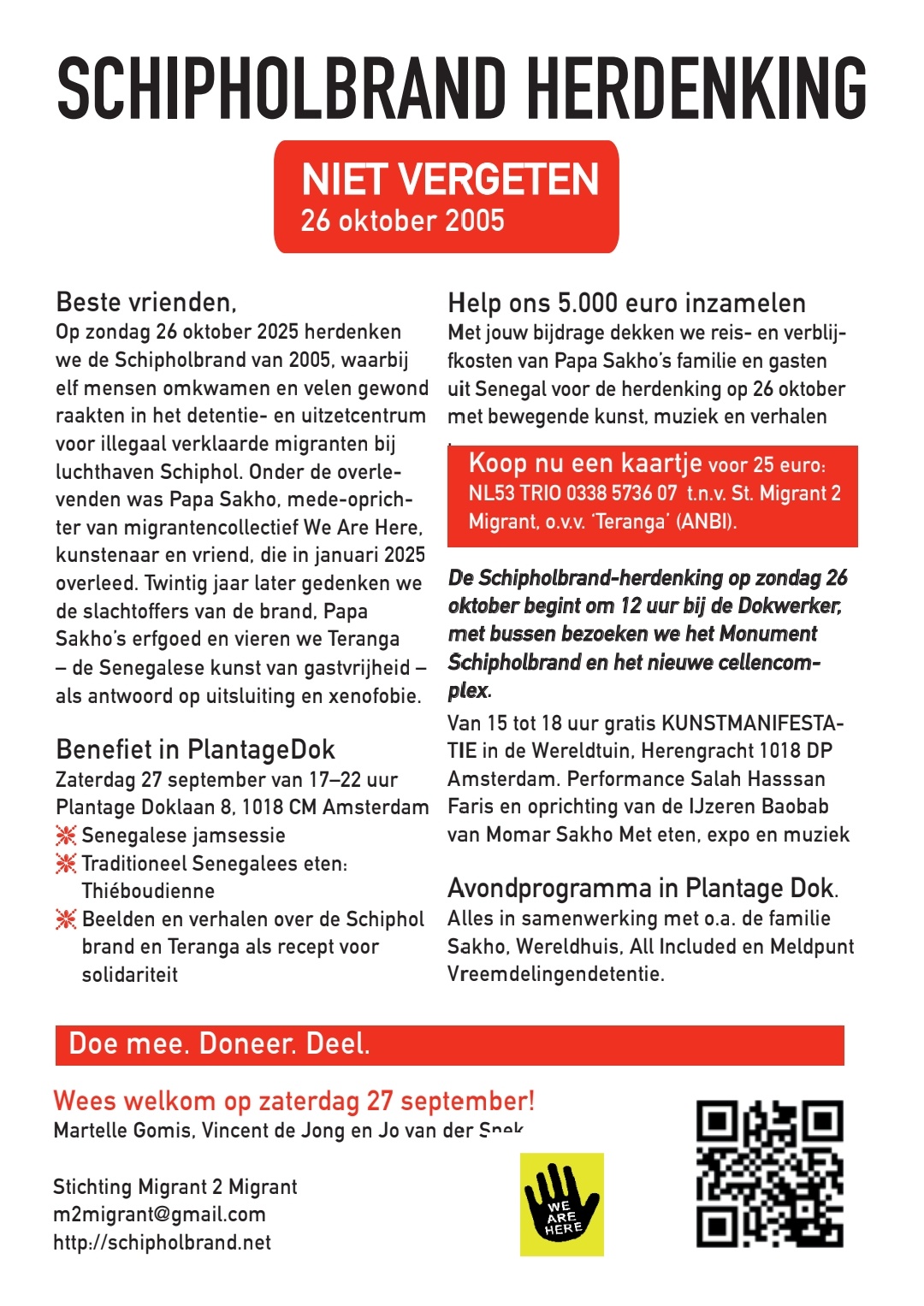 Op zondag 26 oktober 2025 herdenken we de Schipholbrand van 2005, waarbij elf mensen omkwamen en velen gewond raakten in het detentie- en uitzetcentrum voor illegaal verklaarde migranten bij luchthaven Schiphol. Onder de overlevenden was Papa Sakho, mede-oprichter van migrantencollectief We Are Here, kunstenaar en vriend, die in januari 2025 overleed. Twintig jaar later gedenken we de slachtoffers van de brand, Papa Sakho’s erfgoed en vieren we Teranga – de Senegalese kunst van gastvrijheid – als antwoord op uitsluiting en xenofobie.
