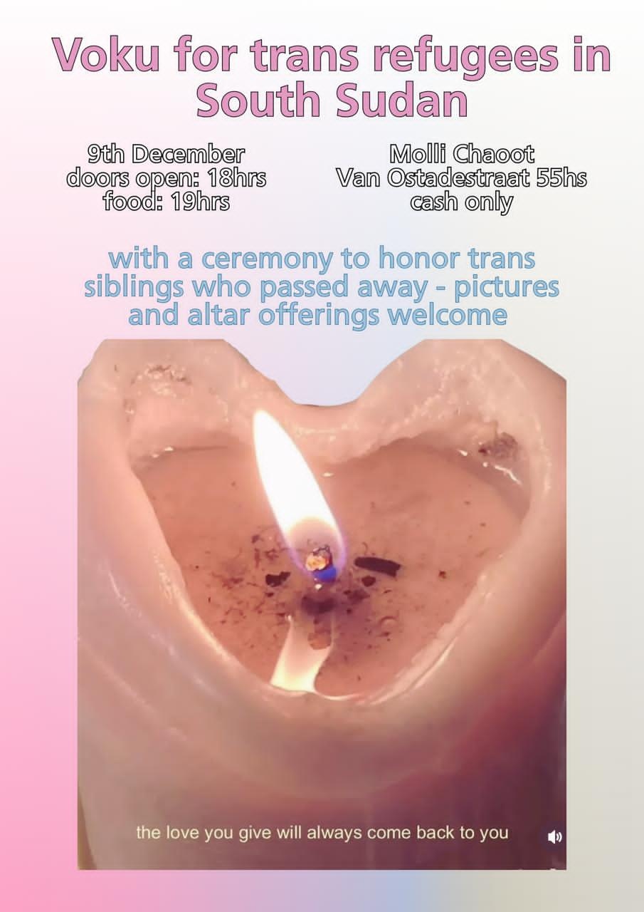 This Tuesday we raising funds to help queer and trans refugees in South Sudan cover relocation costs, medicine, and basic necessities. There will also be space to honor the lives of trans siblings taken from us due to transphobia.