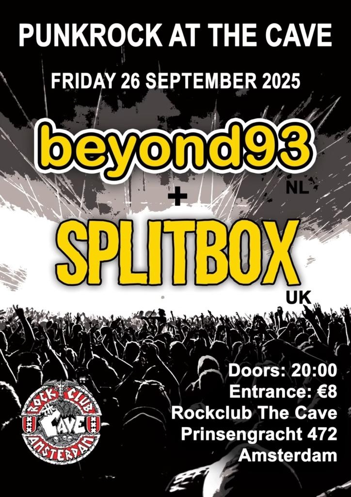 Beyond93, opgericht in 1993 in Hoofddorp, speelde een belangrijke rol in het aansteken van de lokale rockscene, wat leidde tot de oprichting van meerdere succesvolle bands. Hun vroege optredens waren bepalend voor veel van deze (toen nog niet opgerichte) bands. Ze breidden hun bereik uit voorbij de lokale scene en traden jarenlang op in binnen- en buitenland. Tijdens deze periode tekenden ze een platencontract bij Sony/Columbia en brachten ze diverse cd's uit in wisselende samenstellingen. In 2005 besloot de band te stoppen. Begin 2024, tijdens een reünieborrel, ontstond het idee om opnieuw samen te spelen. De vier originele leden, voor het laatst samen op het podium in 1996, repeteerden enkele keren en werden benaderd door een boeker van Patronaat in Haarlem voor een optreden. Dit leidde tot een memorabele show op 30 januari 2025 in Patronaat, waar de zaal zo vol was dat sommige bezoekers bij de deur moesten worden geweigerd. Dit succes motiveerde de band om wekelijks te repeteren en opnieuw shows te geven, waarbij ze hun passie en plezier herontdekten. Ze vergelijken zichzelf graag met een goede fles wijn die met de jaren alleen maar beter wordt.Splitbox (UK)