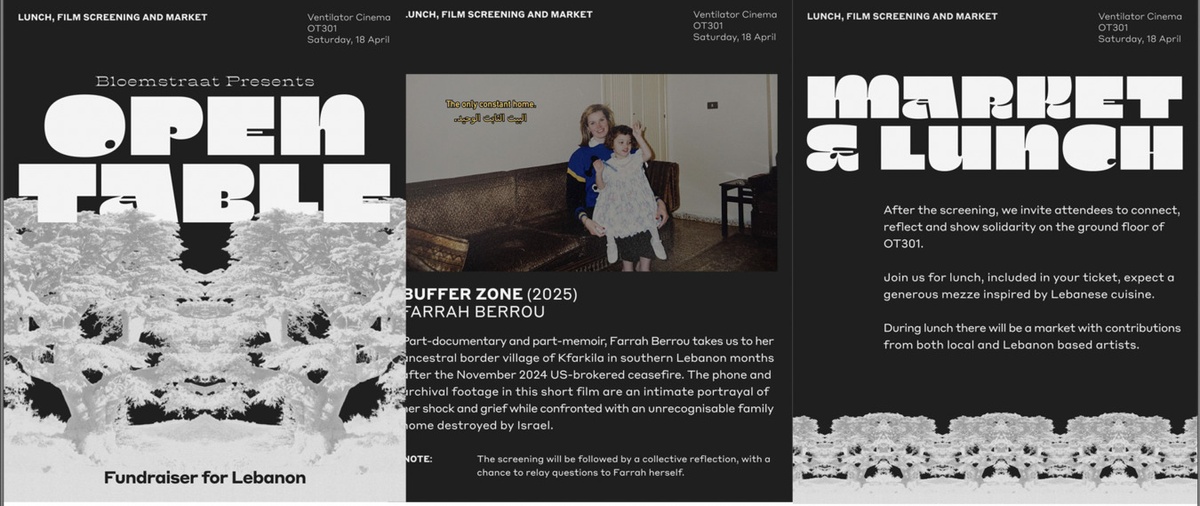 Bloemstraat presents Open Table, a screening, dinner and market event at OT301 & Ventilator Cinema, to raise funds for those displaced by Israel’s illegal invasion and systematic destruction of southern Lebanon .