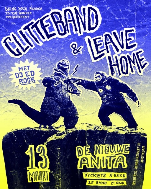 Niemand minder dan Clitteband, dé Nederlandse punkband van dit moment, staat dit keer samen met Leave Home op het podium. Mis het niet om deze bands mee te maken in de unieke sfeer die alleen de Nieuwe Anita heeft.