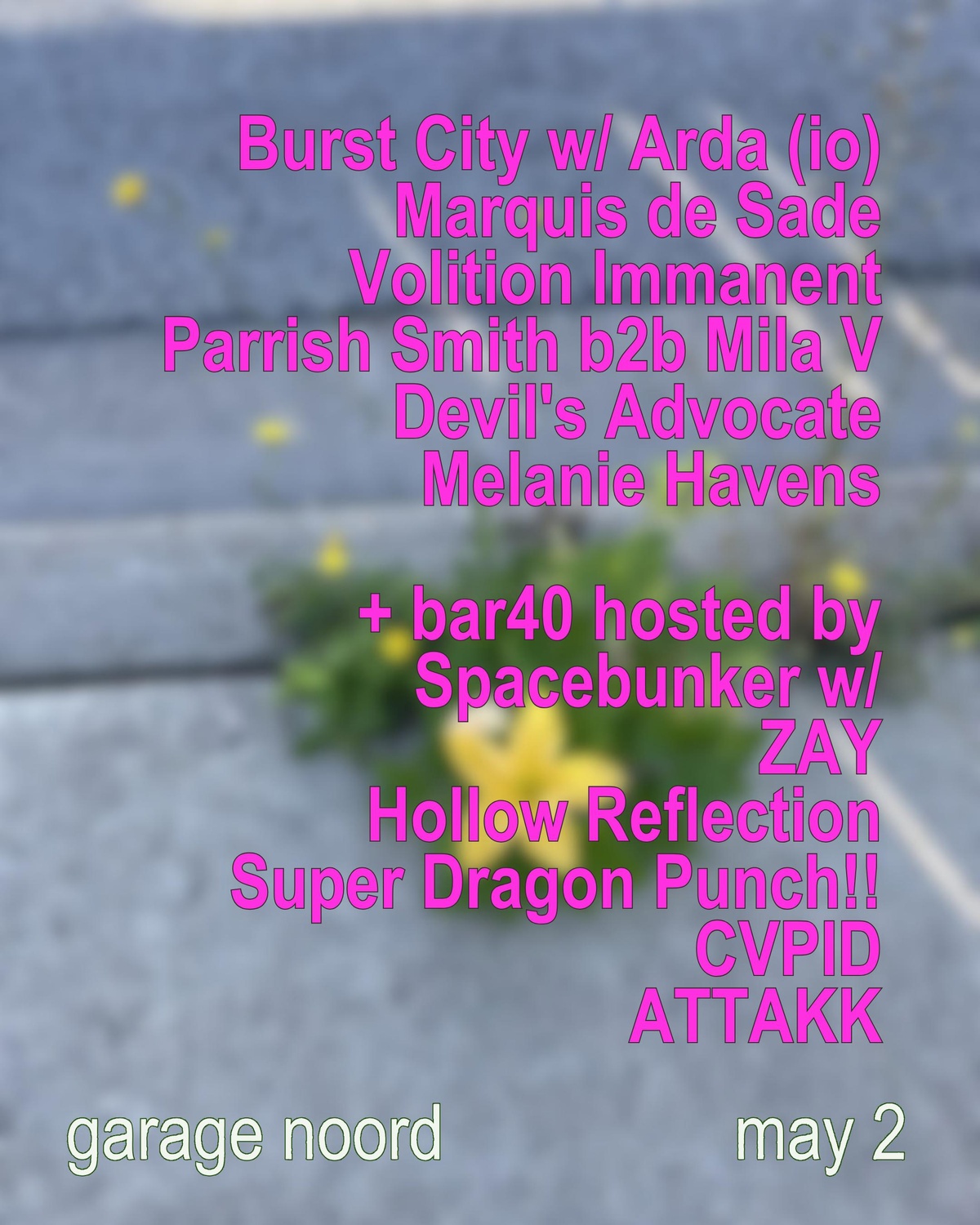 Burst City w/ Arda (io), Marquis de Sade, Volition Immanent + , Parrish Smith b2b Mila V, Devil's Advocate, Melanie Havens + bar40 hosted by Spacebunker