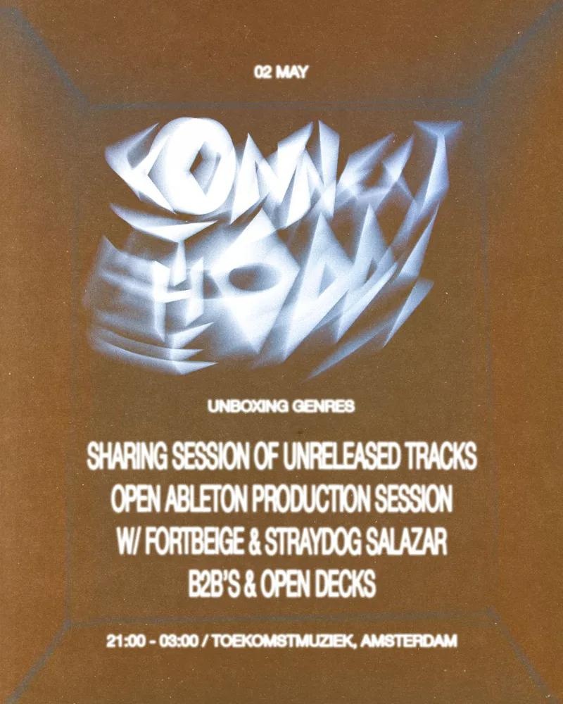 This edition is about Unboxing Genres. Before we party. We will have an open sharing session of unreleased music, where you get to share the unheard, maybe overthought, or ready to ship projects. Apply by sending us a DM. The first hour there's also an production session led by FORTBEIGE and Straydog Salazar. Free to join or learn, whatever you're comfortable with.