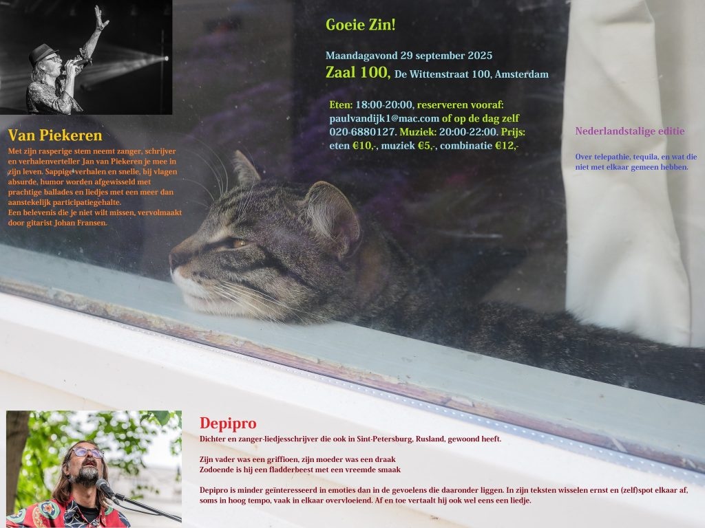 We zijn weer begonnen!Goeie Zin is DE avond in Zaal 100 voor singer-songwriters en semi akoestische muziek. Vanavond Depipro + VAN PIEKEREN