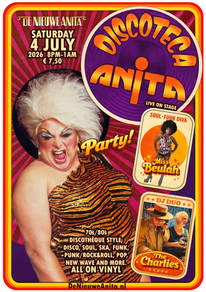 Tonight the deejays play vinyl records straight from a ’70’s/80’s Discothèque. Not only pure Disco music but also Soul, Ska, Funk, Punk/Rock&Roll, Pop, New Wave and more. Live on stage: soul/funk diva: Miss Beulah!