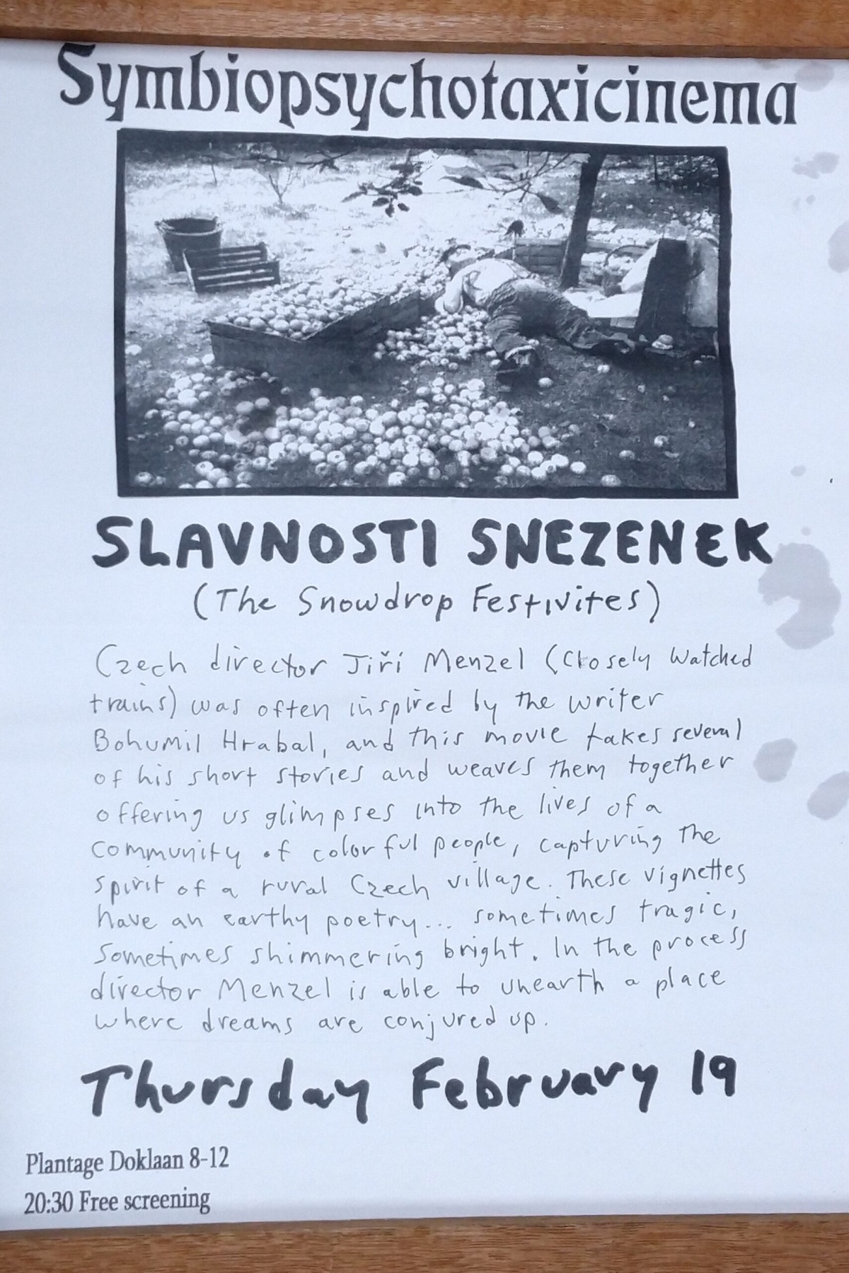 18 open 19 Vegan Food by JAER Kitchen: pilau with salad, vegetables and pumpkin soup 20.30 SYMBIOPSYCHOTAXICINEMA: Slavnosti snezenek (1984) directed by Jiří Menzel