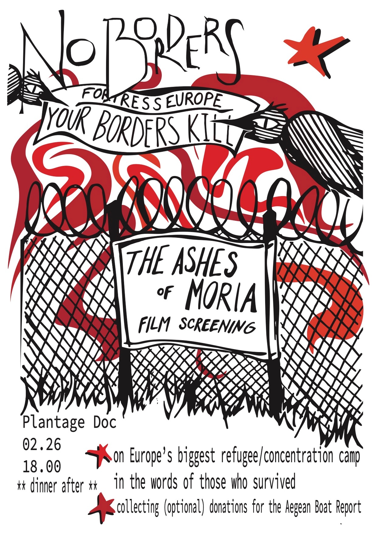 20u No borders film screening: The Ashes of Moria On Europe’s biggest refugee/concentration camp in the words of those who survived. Collecting (optinal) donations for the Aegean Boat Report (Film starts at 20h instead of 18h!)