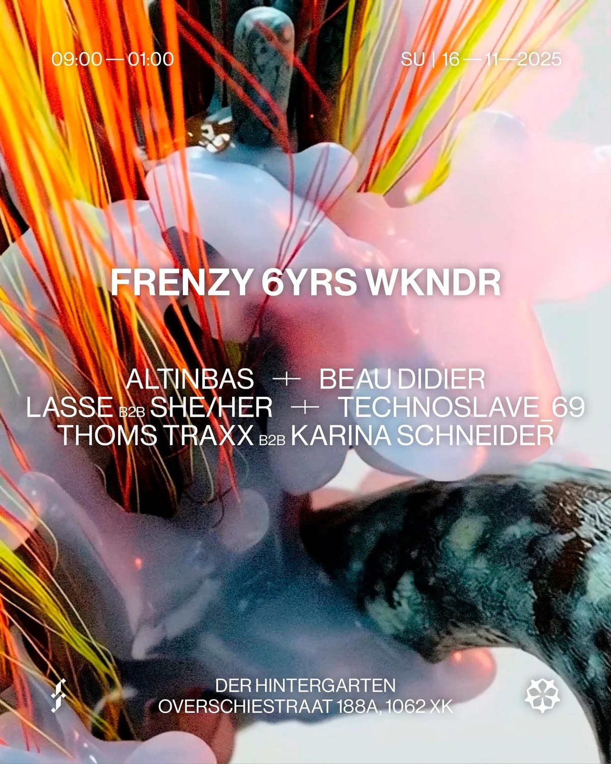 Frenzy 6YR Anniversary! Frenzy celebrates its 6th anniversary with a full weekender. The collective returns to its beloved RADION and, for the first time, takes over Der Hintergarten for the after-hours. From Saturday 23:00 until Monday 01:00, partygoers can expect 26 hours of Frenzy. Guests are encouraged to clear their schedules for the weekend – and keep Monday free. 😉 Line-up [A–Z]: Altinbas, Beau Didier, Beste Hira, Hyperaktivist, Isaiah & Flits, Kaiser, Karina Schneider, Lasse, Matrixxman, She/Her, Technoslave_69, Thoms Traxx