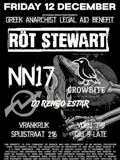VOKU 7-9pm RöT STEWART – fast & ugly hardcore from Belgium NN17 – punk from the sewers of Amsterdam DJ RENGO ESTAR playing ska/punk/oi added to the lineup Crowbite, new Amsterdam folk core punk band...!! All proceeds will go to greek anarchists legal aid.