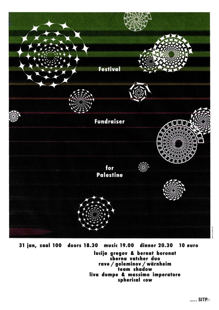 Met: Lucija Gregov & Bernat Boronat, Sberna Vatcher duo, Rave/Goleminov/Wärnheim, Team Shadow, Līva Dumpe & Massimo Imperatore, Spherical CowThe musical underground of Amsterdam is coming together for a fundraiser for Palestine. There will be 6 sets of adventurous music, a communal dinner of maqlube (مقلوبة), and a raffle of merchandise from musicians and artists from Amsterdam and beyond. An eclectic collection of music will be presented, from intimate songs to free jazz, and punk electronic beats until midnight.