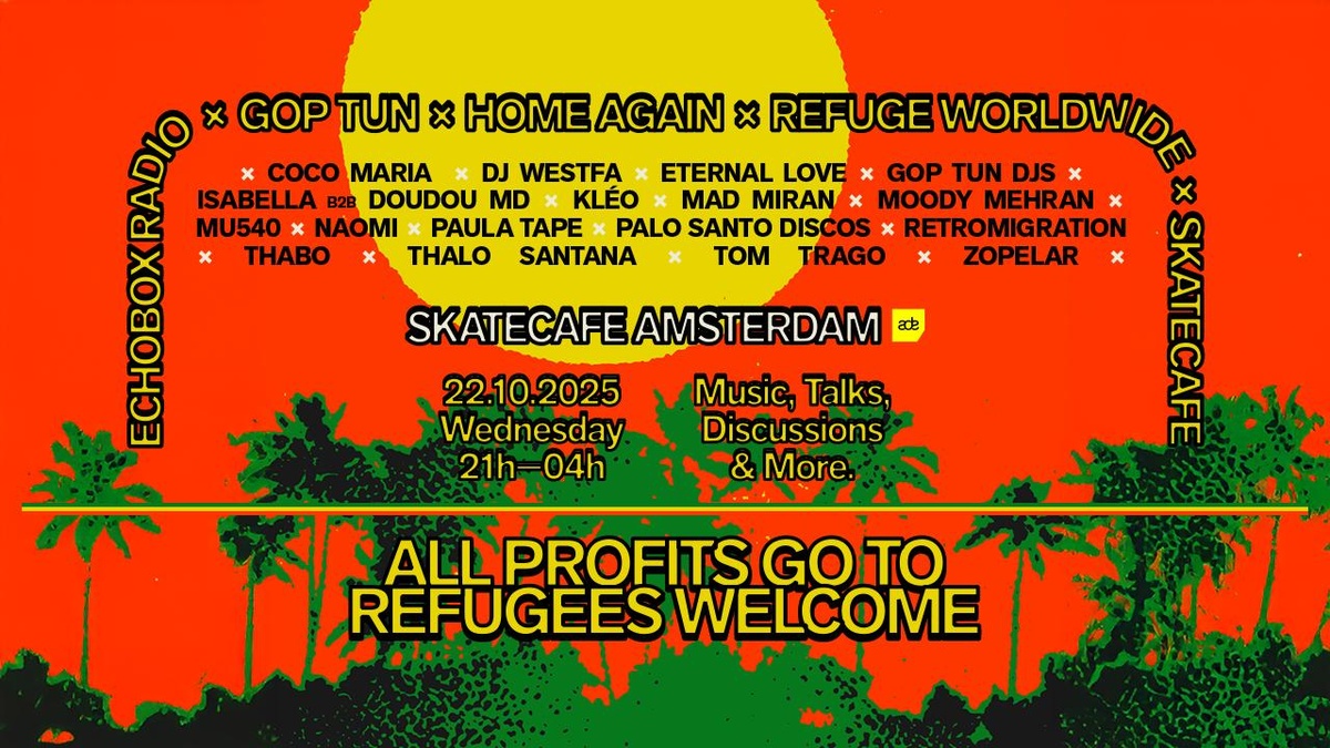 Gop Tun (São Paulo) and Home Again (Berlin) come together for a special day and night at Skatecafe during Amsterdam Dance Event 2025, united by a shared mission: raising support for Refugees Welcome through the power of music and community. The event begins with a series of talks and panels from 17:00 to 21:00, hosted in collaboration with Refuge Worldwide.
