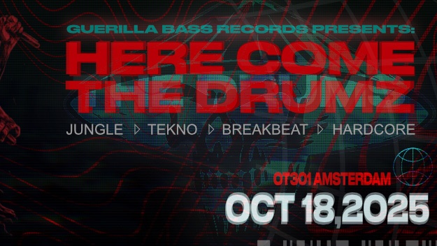 After rattling basements across the Atlantic, Here Come The Drumz lands in Amsterdam. No neon fluff, no mainstream bullshit, just raw energy straight from the core. From the dark forests of Finland to the smoke-stained cellars of the Netherlands, we’ve summoned true warriors of the underground. With two Guerilla Bass mainstays and international guests that live and breathe the sound, we’re lining up a night of unfiltered Jungle,