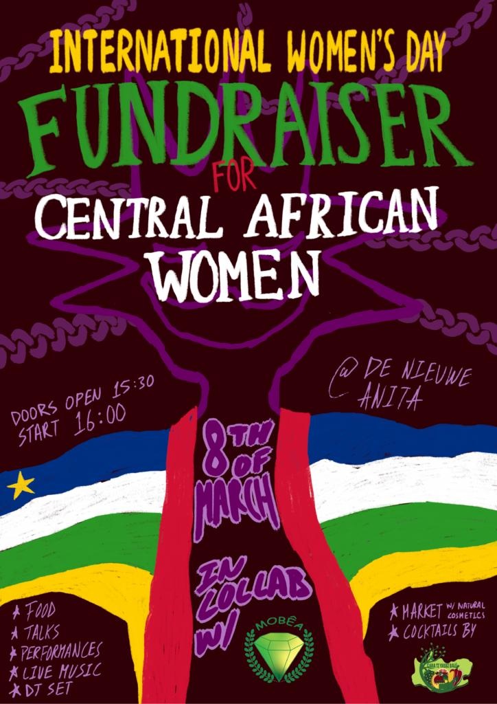 March 8th marks International Women’s Day; in the spirit of solidarity to all women everywhere, we feel the urgency to assign our attention and action towards women in the Central African Republic. Located in the heart of Africa next to Tchad, Soudan , Congo and Cameroun but still barely known by the rest of the world. Program 15.30 Doors open: There will be a mini-market and bake sale where you can already make donations to grassroot organisation Mobea 16.00 Workshop by The Pan-African Post – an educational platform by Terna, Jules and Roberto. They will offer a workshop educating on the history of the Central African Republic, their current situation and relationship to the rest of the continent from a decolonized, womanist lens. 17.00 Live music by Amara on Kora (an African harp) 18.00 Performances by Ash performing a poem; a performance by Lisa exploring how women are perceived and how they can reclaim themselves (nudity involved); and Trixie will perform a feminist pole dance act. 18.30/19.00 African food (vegan + non-vegan) and cocktail (donation-based) + DJ-set by DJ Roos (foyer) 20.00 Live music performance by Afrogroove – Zippora & Abriel 20.45 Dj-set by DJ Jelee (foyer)21.30 Live music performance by Hatoon, an afrofuturistic fairy