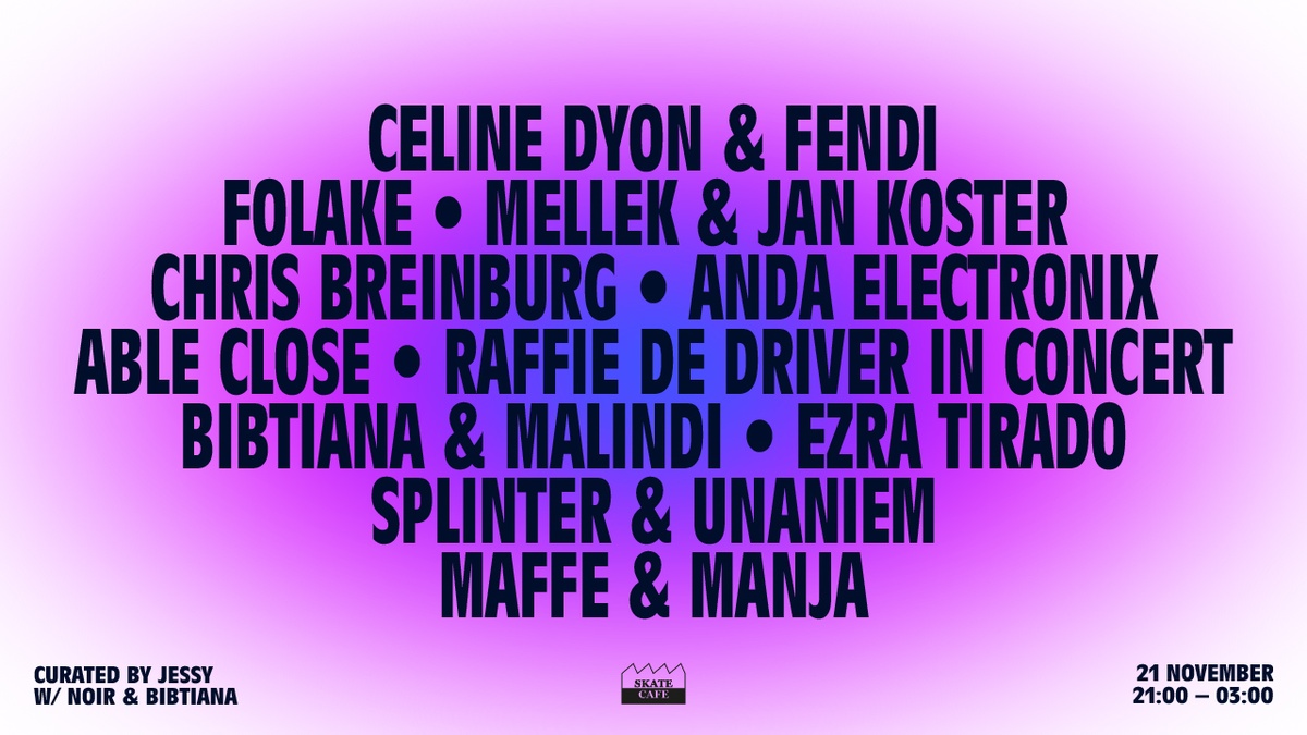JESSY x NOIR x BIBTIANA: RAFFIE DE DRIVER (LIVE) l, FOLAKE, ABLE CLOSE, EZRA TIRADO, CHRIS BREINBURG, MALINDI, CELINE DYON & FENDI, MELLEK & JAN KOSTER, SPLINTER & UNANIEM, ANDA ELECTRONIX, MAFFE & MANJA, MC ROBBA