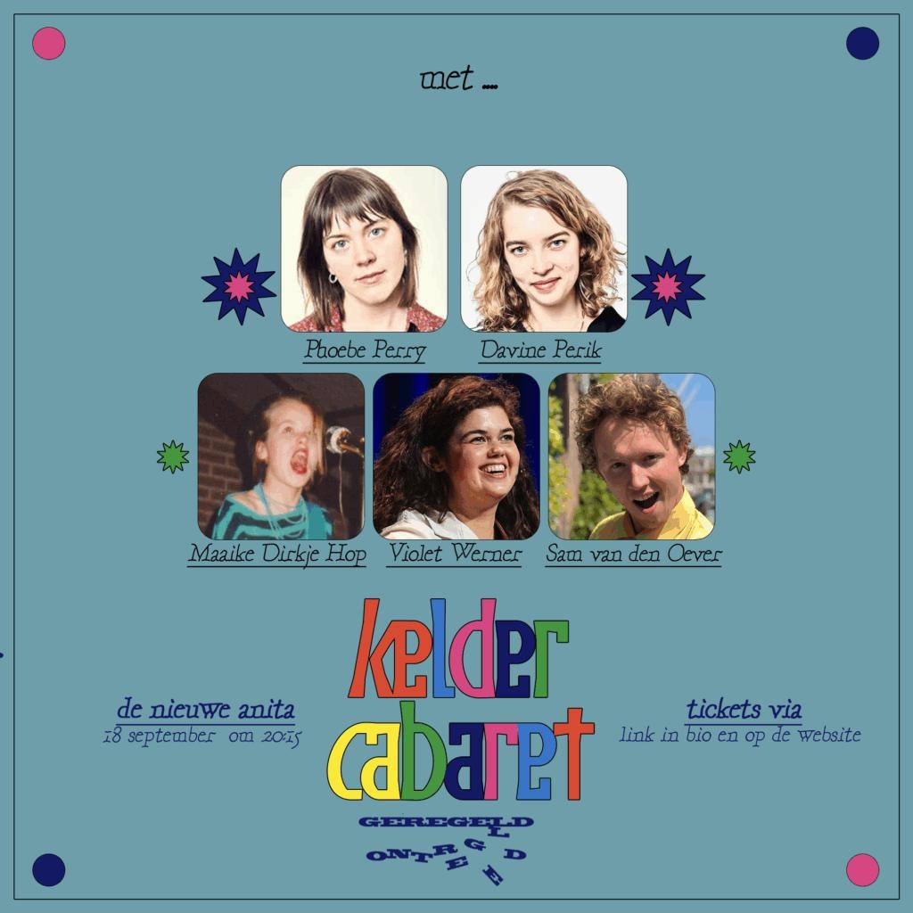 Keldercabaret in de Nieuwe Anita is terug voor een nieuw seizoen! Voor de eerste editie op 18 september hebben we weer een geweldige line-up voor jullie geregeld met nieuwe talenten en meer gevestigde namen. Voor slechts 12,50 (excl. service kosten) euro kan je genieten van een avondvullend programma met onze favoriete cabaretiers. De inloop is vanaf 20:00 en aanvang is om 20:15.