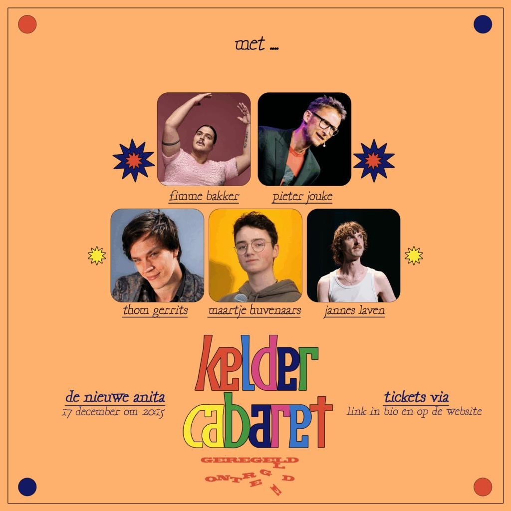 Keldercabaret met Fimme Bakker, Pieter Jouke, Thom Gerrits, Maartje Huvenaars en Jannes Laven