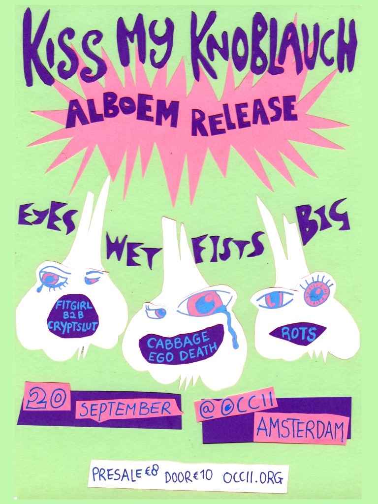 Kiss My Knoblauch cordially invites you to join in the celebration of the birth of the first alboem: Eyes Wet Fists Big. On this tasty night you will be bemused and amused by Rots, Cabbage Ego Death (BE) and DJduo Fitgirl & Cryptslut. KMK will play their album and some bonus songs, YOU will get the first chance to get the CD and some other special alboem merch. Projections by Adil from Not Shit Print. Be there or else!