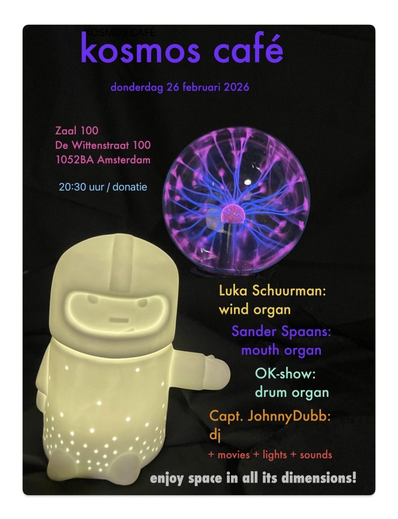 Met: Luka Schuurman - wind organ, Sander Spaans - mouth organ, OK-Show - drum organ, DJ Capt. JohnnyDubLuka Schuurman: Hello! This Thursday I’m playing another two sets on electric chord organ on this very cosy cosmic collaborative occasion in Zaal 100.
