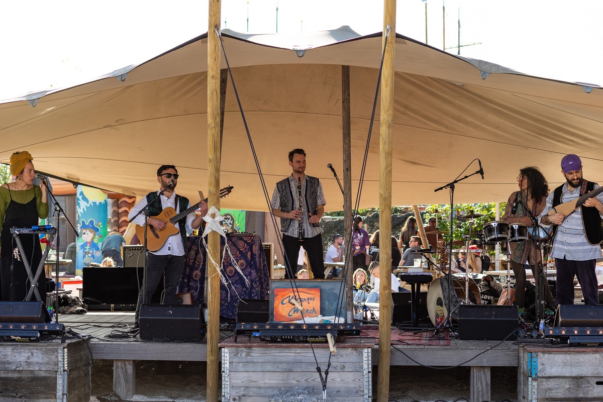 Mèraque stems from a passion for music from the Balkans and curiosity about what happens when you mix it with influences from South America and the Middle East. Let yourself be carried away by the energetic percussion, lively electronics, the Arabic oud and melancholic accents of the clarinet. All these elements merge into enchanting live sets full of improvisation.