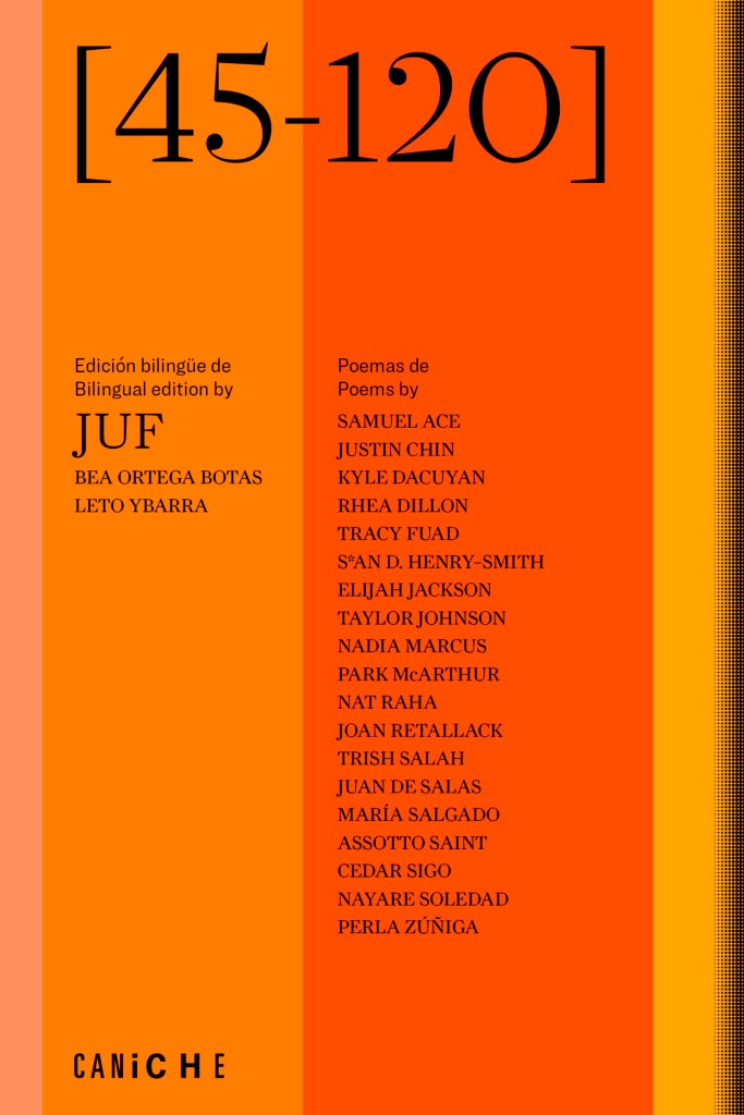 45 – 120 features Samuel Ace, Justin Chin, Kyle Dacuyan, Rhea Dillon, Tracy Faud, Elijah Jackson, Taylor Johnson, Nadia Marcus, Park McArthur, Nat Raha, Joan Retallack, Trish Salah, Juan de Salas, María Salgado, Assotto Saint, Cedar Sigo, S*an D.Henry-Smith, Nayare Soledad and Perla Zúñiga.