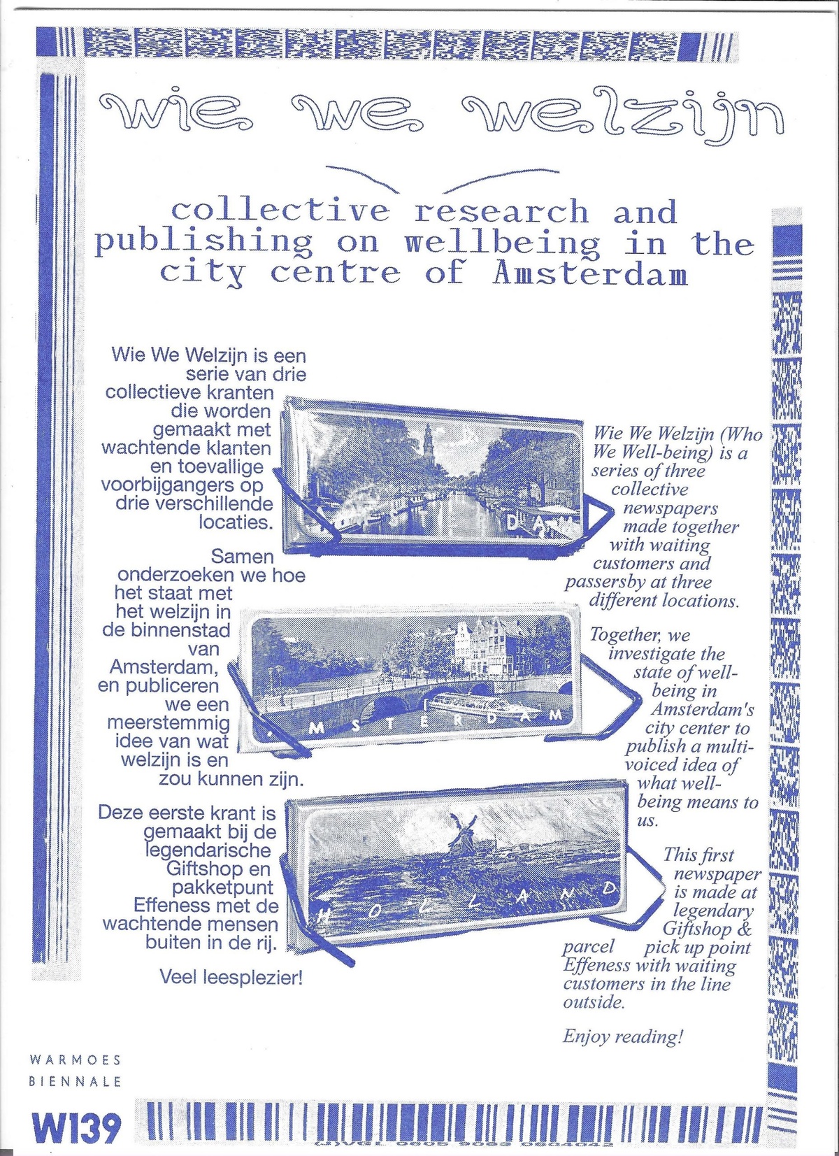 During the Warmoes Biennale, invited by W139, mul-thee-fuhngk-shuh-nl engaged in conversations about well-being with waiting customers and people passing by. What is the state of well-being in Amsterdam’s city center, and what factors shape it? Stories, perspectives, and ideas were collected and compiled into a series of three free newspapers. These were distributed throughout the neighborhood and can be picked up by visitors at all biennale locations.