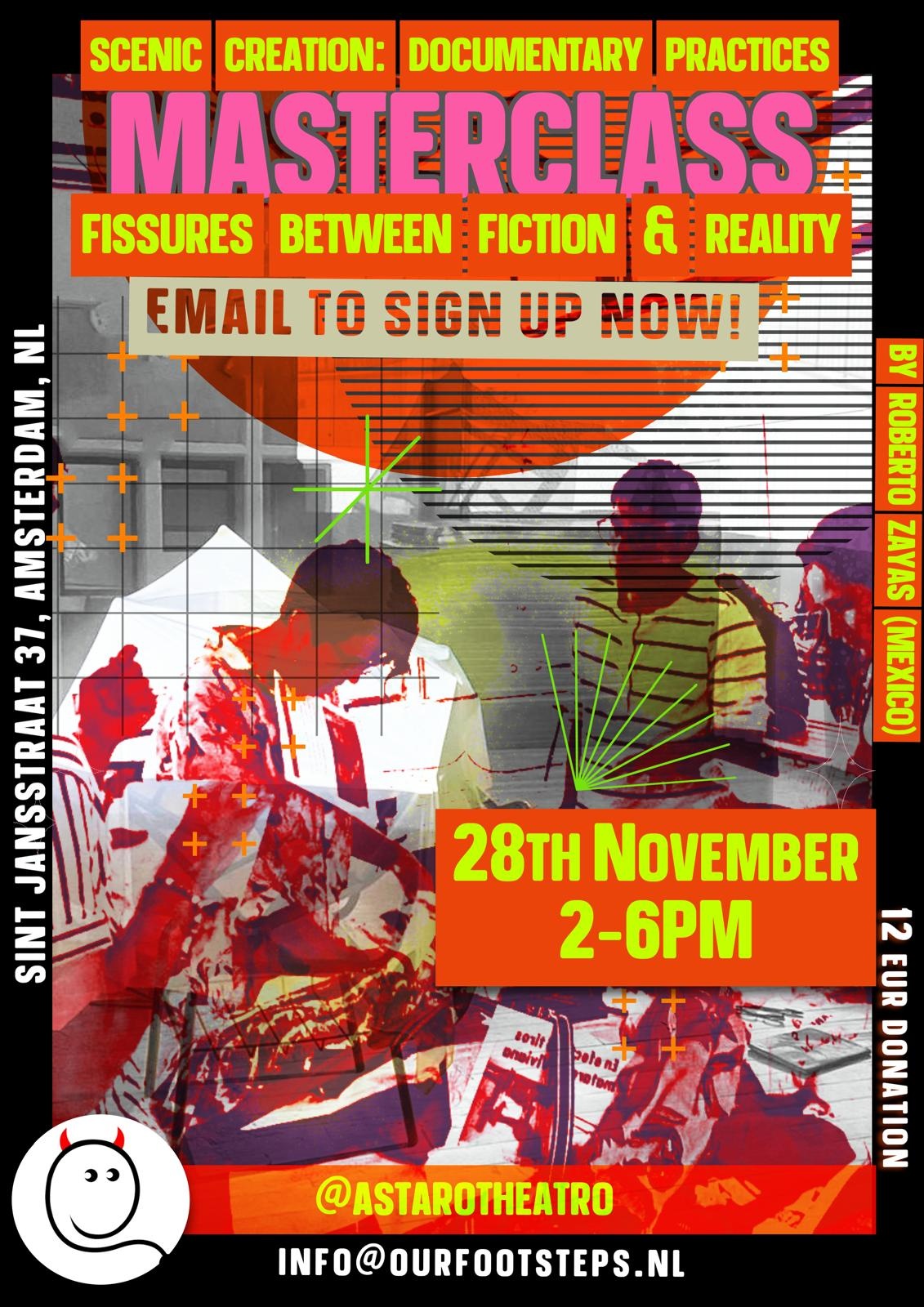 The Masterclass “Scenic Creation: Documentary Practices, Fissures between Fiction and Reality” proposes a strategy that provides various research-creation tools to be applied in the design of a scenic proposal that contains archives and documents that are potentially attractive to participants. It aims to investigate the problems facing the current justice systems in Mexico and the Netherlands, based on the experience of TDEE, addressing and bringing to the stage the realities of prisons and justice in Mexico, promoting a culture of peace through theatrical practices. During the workshop, some of the concepts that its director, Roberto Zayas, has worked on will be presented in order to open up the discussion on ways of addressing topics such as memory, testimony, and absence in relation to the idea of living archives, with the aim of exploring the possibilities for creating alternative strategies in artistic and theatrical creation. These strategies can be used to blur the boundaries between the notions of reality and fiction, thus allowing us to move indistinctly from one side to the other to reverse signs, challenge norms, and unbalance certainty.
