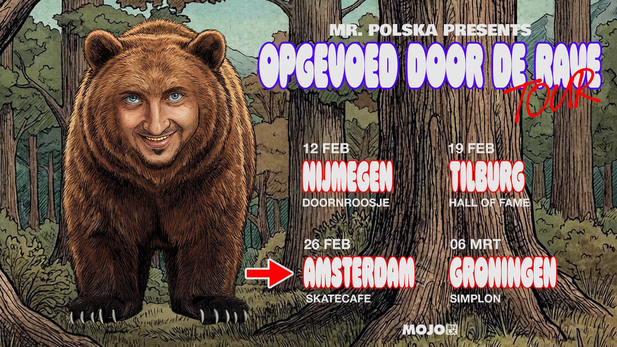 Op 26 februari komt Mr. Polska terug uit hibernation en doet hij met zijn “Opgevoed Door De Rave” tour een stop bij Skatecafe in Amsterdam. Na releases als Ostatnia Nutka, geproduceerd door Antoon, de virale comeback van POLSKA JUMPSTYLE met inmiddels meer dan 14 miljoen streams, en LA VIDA LOCA met Natte Visstick, luidt Mr. Polska een nieuw hoofdstuk in. In 2026 richt hij zijn vernieuwde sound niet alleen op Nederland en Polen, maar ook internationaal. Als support brengt hij Wally uit Den Haag mee.