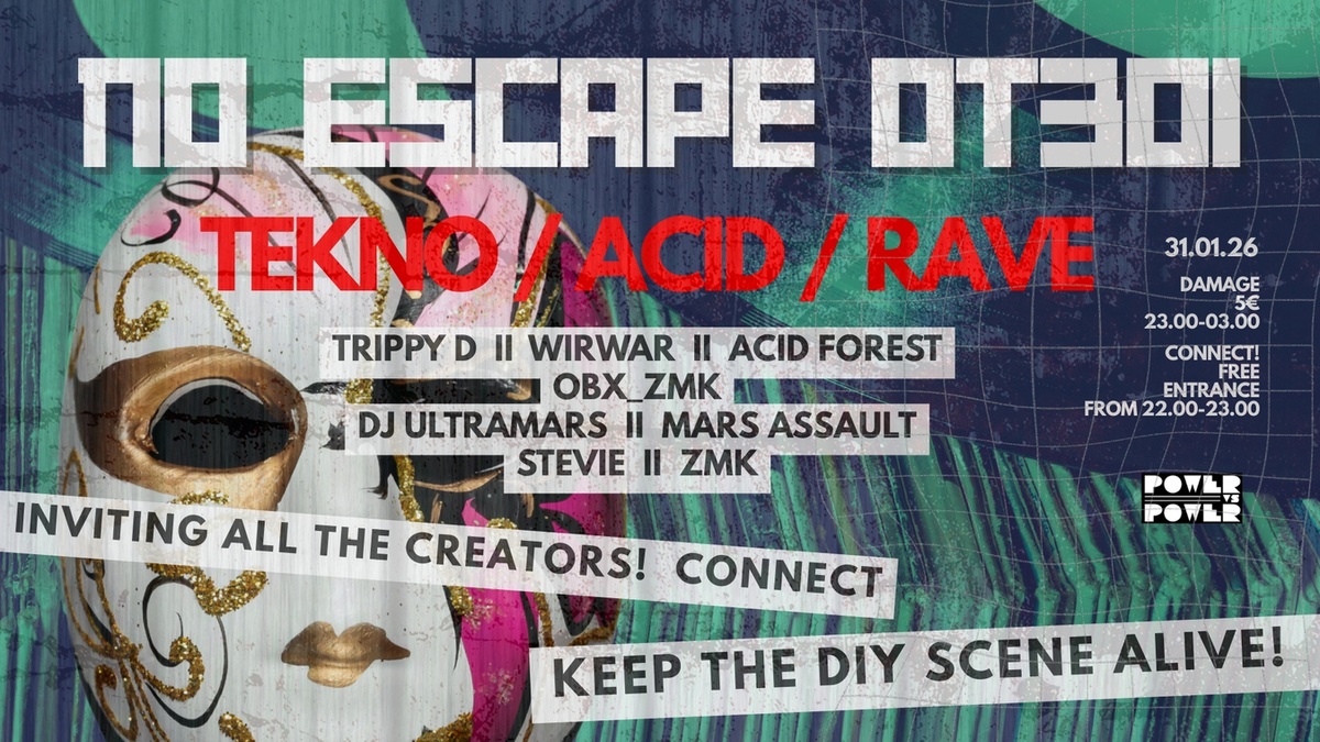 NO ESCAPE returns to OT301 on January 31, 2026. We invite all creators and underground souls to join this platform for connection and sound. We are returning to the DIY roots of rave culture—much like the past, in times when the spirit of the gathering mattered more than knowing exactly who was on the lineup. It is about passion over profit. This night is designed to support the venue and keep the underground scene thriving, reclaiming a spirit where the music and community come first.