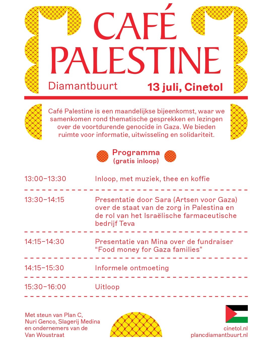Café Palestine wordt georganiseerd met steun van Plan C, Nuri Genco, Slagerij Medina en ondernemers van de Van Woustraat