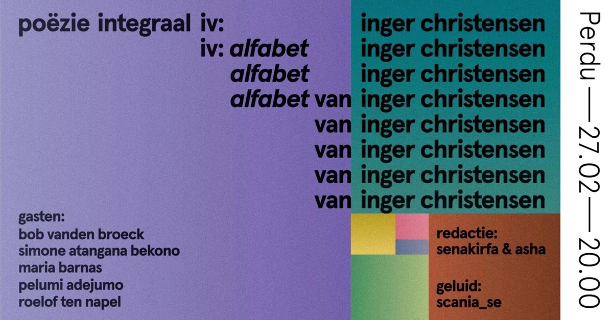 In de vierde editie van de reeks Poëzie Integraal, waarin telkens één dichtbundel van begin tot eind wordt voorgelezen, staat dit keer de bundel alfabet van Inger Christensen centraal. De avond viert de Nederlandse vertaling van dit invloedrijke werk, uitgegeven door Koppernik in een herziene vertaling van Annelies van Hees.