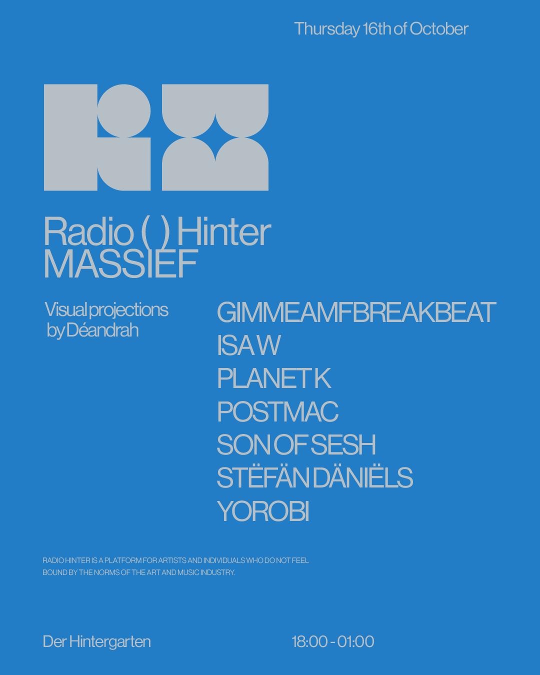 Dear friends, Radio Hinter presents MASSIEF With a focus on Bass and Breakbeat culture, MASSIEF takes over Radio Hinter and der Hintergarten on the 16th of October. After a string of underground events around Amsterdam over the past two years, the collective is stepping up to take over our live stream and the bar space in their own unique style, representing a growing Bass and Breakbeat renaissance in modern dance music culture. This takeover features a stacked line up of local Bass and break beat specialists. DEEJAYZ: 18:00 - 19:00 POSTMAC 19:00 - 20:00 ISA W 20:00 - 21:00 STËFÄN DÄNIËLS 21:00 - 22:00 PLANET K 22:00 - 23:00 YOROBI 23:00 - 00:00 GIMMEAMFBREAKBEAT 00:00 - 01:00 SON OF SESH VISUALS: DÉANDRAH ALL NIGHT LONG Drop past the space for the Bass weight full experience. Otherwise, tune in on the Radio Hinter channel on Intergalactic FM. As always, the entrance is free with access for all. Address: Overschiestraat 188A