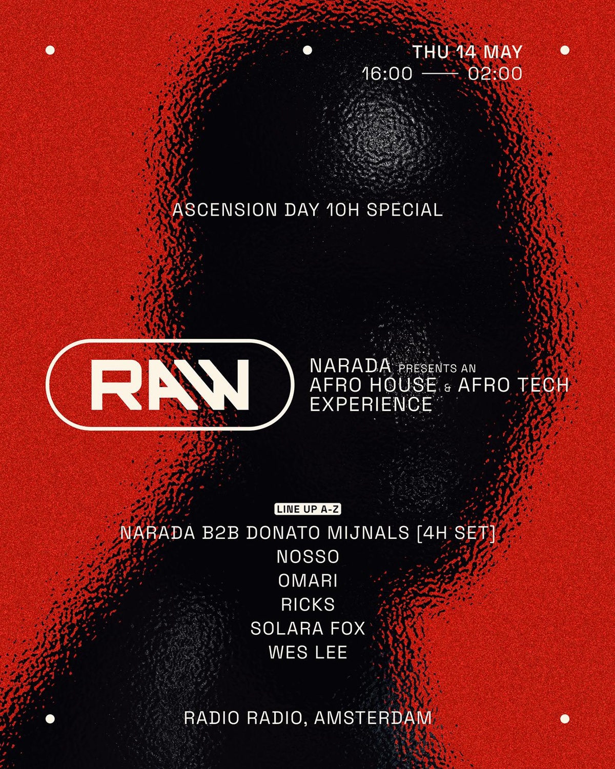 On the 14th of May, RAW returns to Radio Radio for a day-to-night gathering. Following a well received first edition, NARADA brings his concept back to the venue, continuing to explore the intersection of afrohouse and afrotech in a more intimate club setting. Running from daytime into the late hours, the programme features DJ's as NOSSO, OMARI, Solara Fox, Wes Lee and RICKS. The night will also include an extended 4hr B2B set by NARADA and Donato Mijnals.