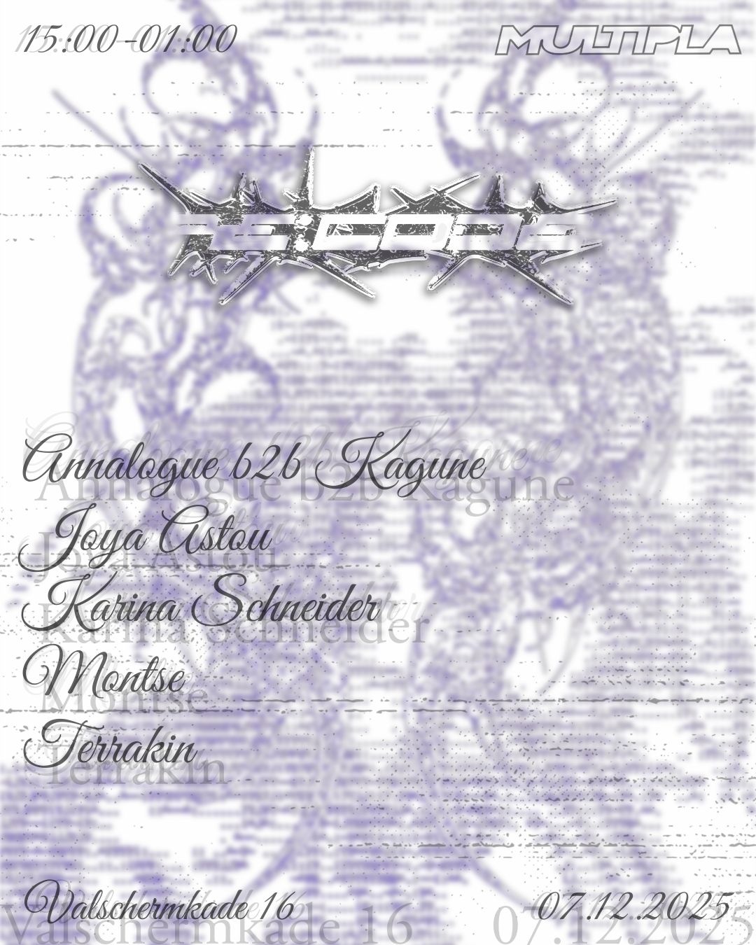 From 15:00 till 01:00, Multipla transforms into a space for deep dub and driving techno - a slow build into full motion. Experience a special line-up of established and rising artists shaping the Amsterdam scene.