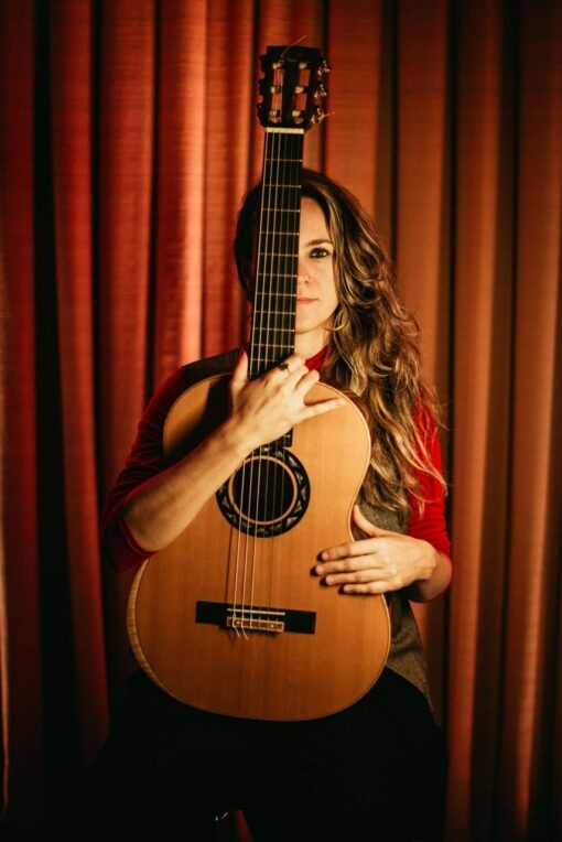 Op het podium speelt de zangeres haar eigen nummers op een intieme en verfijnde manier met haar stem en gitaar.