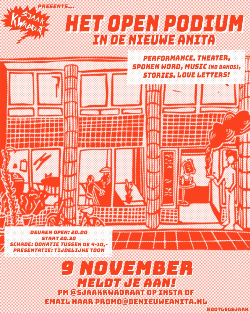 English submissions also allowed! You can apply for the Open Stage by sending a PM to @sjaak_kwadraat on Insta, if you don’t have Insta, good for you! Meta sucks... Then you can apply by sending an email to promo@denieuweanita.nl