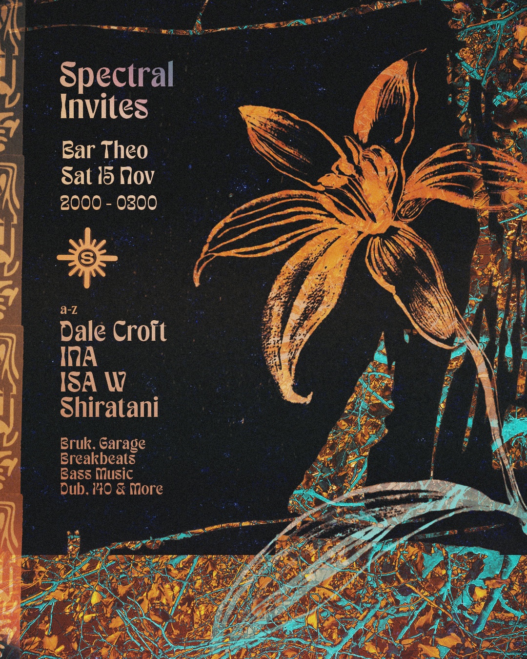 As the leaves turn orange Spectral returns to Bar Theo this Saturday, continuing explorations in breaks, bass and leftfield something or others.