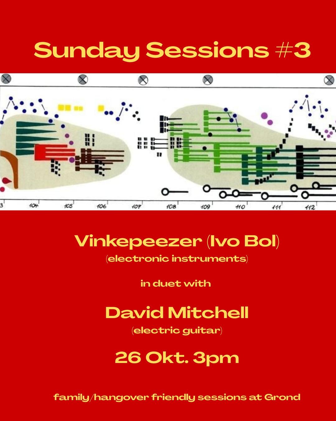 for the 3rd edition of Sunday Sessions we open the bar again, mellow sounds will permeate the space and we have a musical duet with Vinkepeezer (Ivo Bol) on electronics and David Mitchell on electric guitar.