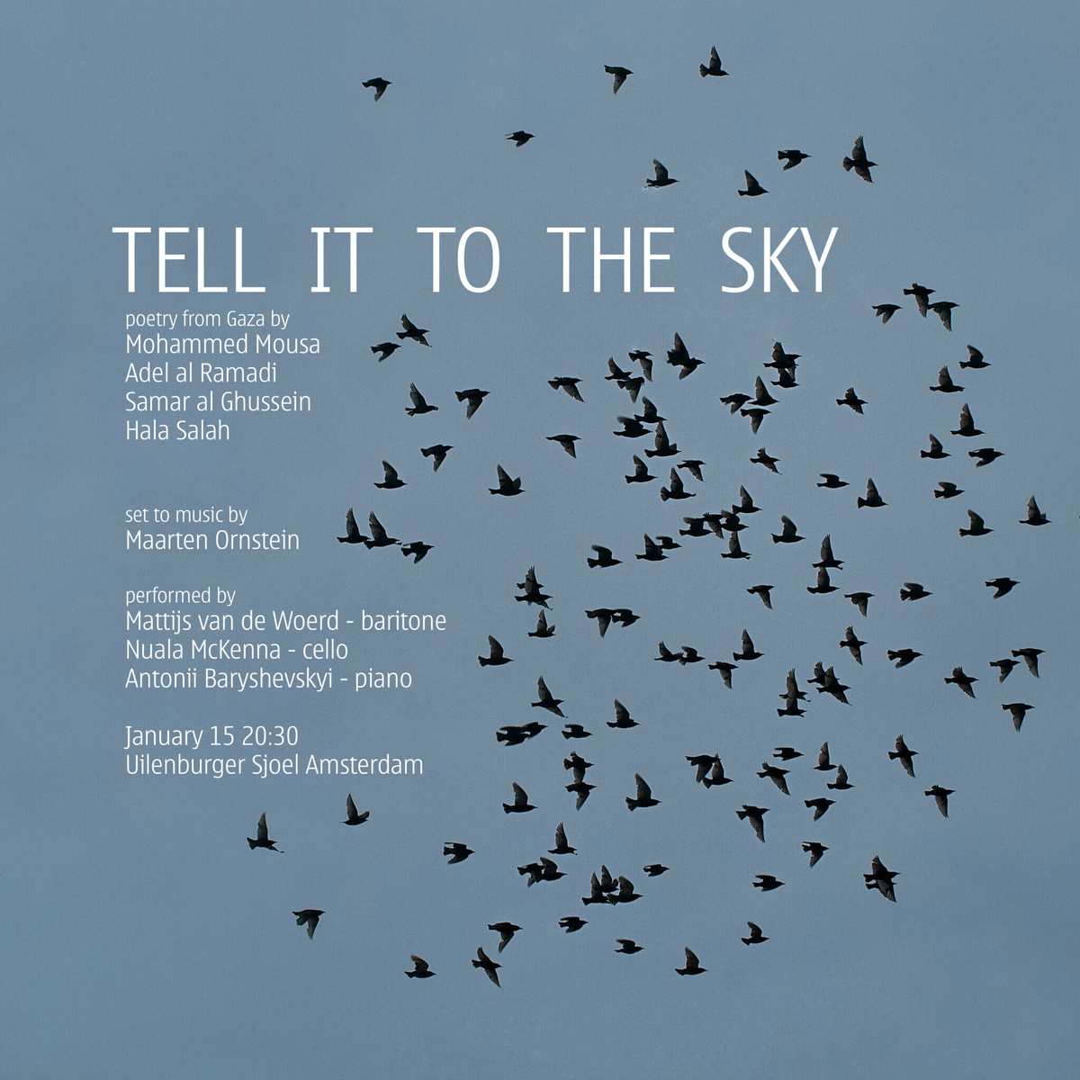 Tell it to the Sky is a new series of six songs for baritone, piano and cello, based on texts by poets currently living (and surviving) in Gaza: Mohammed Mousa, Adel al Ramadi, Samar al Ghussein, and Hala Salah. Their poignant poetry captures both hope and despair — hope for surviving another day, for reuniting with a loved one, for rain and flowers; and despair over lost friends and family amid the seemingly endless slaughter, destruction, hunger, and chaos.