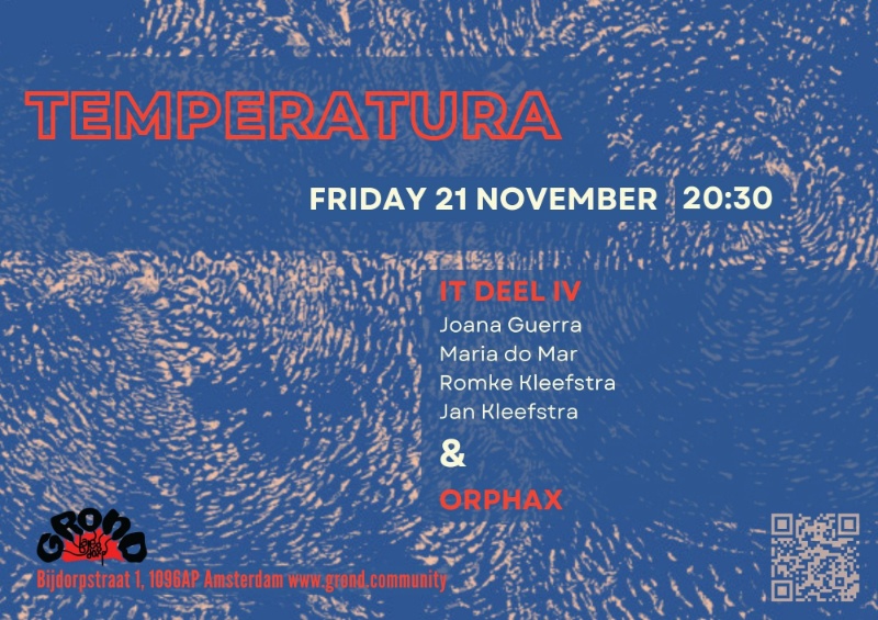 Friday 21 November, TEMPERATURA presents the latest edition of the Kleefstra brothers’ poetry-and-music project, IT DEEL IV. In this edition, Romke and Jan Kleefstra collaborate with the cello player Joana Guerra, and the violin player Maria do Mar. The same evening, a solo live-electronics performance by Orphax, aka Sietse van Erve.