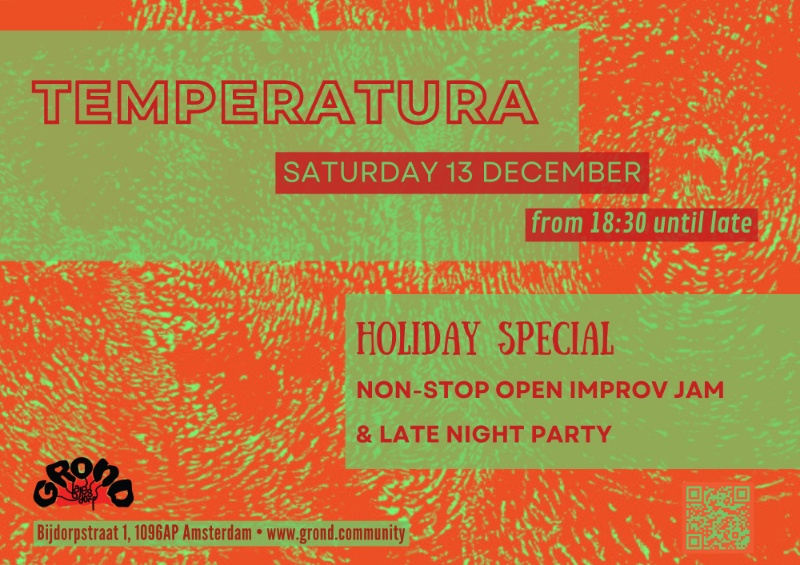 Stage and Bar will be open from 18:30FREE ENTRY – Donations welcome: support GROND by making a donation online here.On Saturday, December 13, TEMPERATURA celebrates its first 10 editions and the end of 2025 with a special event!We’ll start the evening with a non-stop free improv jam session, open to anyone who would like to participate.*The stage opens at 18:30 and runs until everyone is exhausted. Bring your sounds, or simply join us for drinks and snacks at any time!After that, we’ll keep the party going with DJ sets until late.* If you’d like to participate, you can jump in at any time with no commitment. We’ll have several mics and guitar amps ready for those who need electronic equipment. Keep it simple and make sure you can blend in smoothly (no soundcheck provided!). If you have any questions, send us an email to temperatura.amsterdam (at) gmail (dot) com