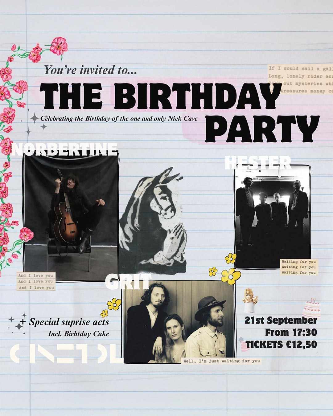 The Birthday Party is een mini-festival ter ere van de verjaardag van Nick Cave, gevierd door bands die geïnspireerd worden door zijn waarheid, sound, lyrics en presence. Luid, intiem en stijlvol. Een avond vol noise, diepe bas sounds, melancholische gitaren en gedetailleerde tekst. Met secret surpise acts, onze meest geliefde Cave-songs gespeeld in eigen versies, een nu nog geheim debut optreden, én een prijs om te winnen. Inclusief verjaardagstaart.