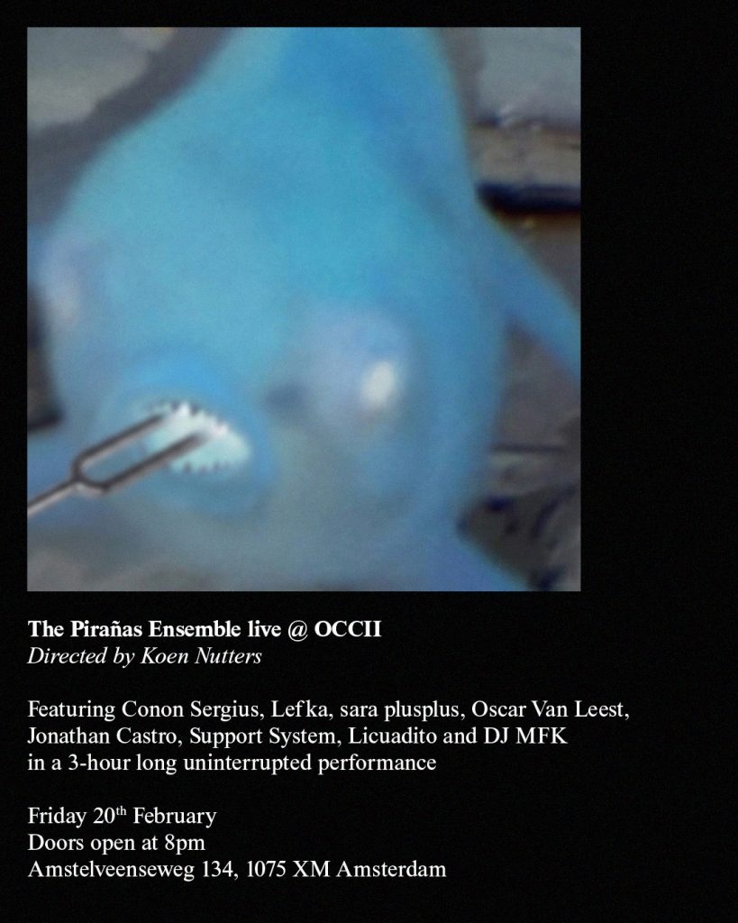 The Pirañas Ensemble will make their debut at OCCII, following the score and temporal structure defined by Koen Nutters in a three-hour long session of semi-improvised music. The performance will combine individual and collective moments, with transitional and improvisational elements.